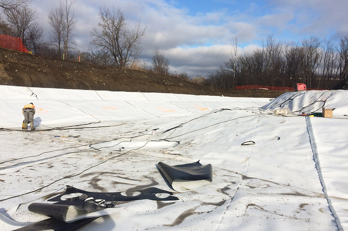 The project comprised a Water Puddle method (ASTM D7002) survey of white LLDPE geomembrane used in the Betrand stream redirection project. The total area of geosynthetic material surveyed was around 4,000m 2 .