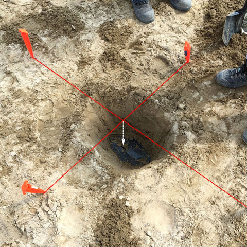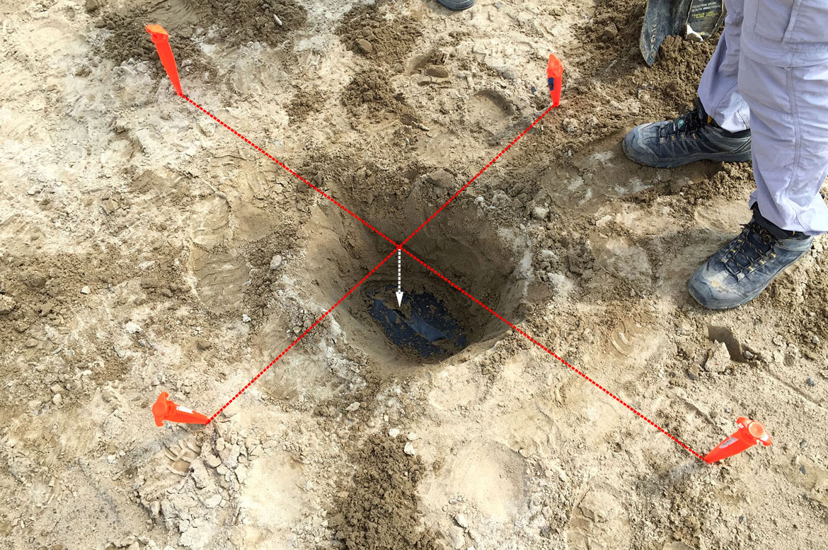 The dipole method was used to locate the fault, an electrical leak location method standardised by the ASTM (D7007) and effective on up to 1m of covering materials, with optimal precision at 30cm and below.