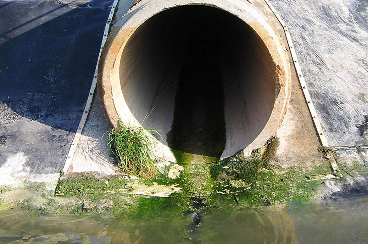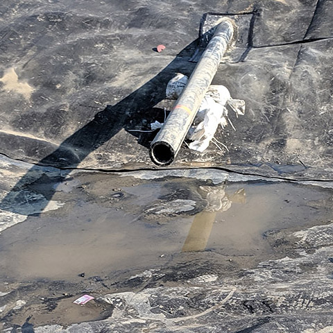 In this case, pipe is laid through the geomembrane layer(s) to transport liquid to an adjacent well where it is stored before passing into the pump system. These systems sometimes use steel pipes which conduct electricity and can create false leak signals. In such cases the steel pipe should be avoided, and if the accumulated water comes into contact with the pipe, measures should be taken to isolate the pipe temporarily.Even when the pipe is non-conductive, once the liquid makes contact with the concrete manhole the electrical current can reach the grounding electrode and generate a false leak signal. The pipe should therefore be kept dry or temporarily blocked in order to ensure electrical isolation at the basin’s low point.