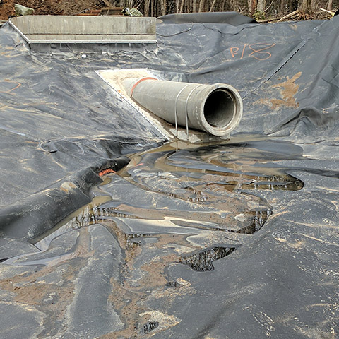 These stations are generally comprised of concrete and pipework and are therefore electrically conductive. In regard to the water lance method, the station represents a large fault in the geomembrane layer, creating false leak signals as the water used during the survey runs toward the basin’s low point and makes contact with the station’s conductive elements. It is sometimes necessary to install a physical barrier around the station with clay or bentonite to prevent water making contact with the station during the test.